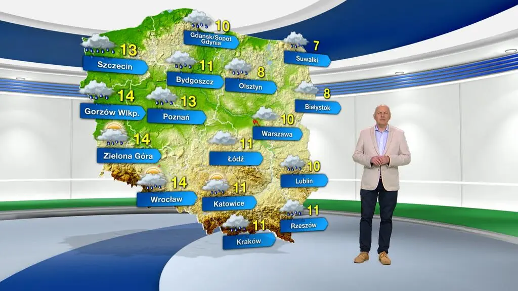 Piątek przyniesie pochmurną aurę z niewielkimi przejaśnieniami. W południowo-wschodniej, zachodniej i północnej części kraju wystąpią okresowe opady deszczu do 1-5 litrów wody na metr kwadratowy. Termometry pokażą maksymalnie od 7 stopni Celsjusza na Suwalszczyźnie, poprzez 11 st. C w regionach centralnych, do 14 st. C na Ziemi Lubuskiej i Dolnym Śląsku. Powieje południowo-zachodni i zachodni wiatr, umiarkowany i dość silny, który w porywach na północy rozpędzał się będzie do 50-60 kilometrów na godzinę.
