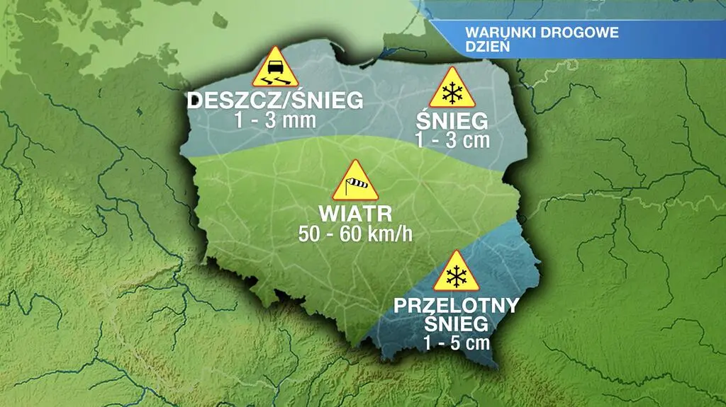 Piątek upłynie pod znakiem pochmurnej aury z rozpogodzeniami. Na północy i północnym wschodzie Polski prognozuje się przelotne opady śniegu do 1-3 centymetrów, na Wybrzeżu deszczu ze śniegiem. Do południa opady śniegu również wystąpią na Lubelszczyźnie, Górnym Śląsku, w Małopolsce i na Podkarpaciu do 1-5 cm. Na termometrach zobaczymy maksymalnie od 0 stopni Celsjusza na Warmii i Suwalszczyźnie, przez 2 st. C w centrum kraju, do 4 st. C na Dolnym Śląsku. Powieje zachodni, umiarkowany i dość silny wiatr, w porywach do 50-60 kilometrów na godzinę.
