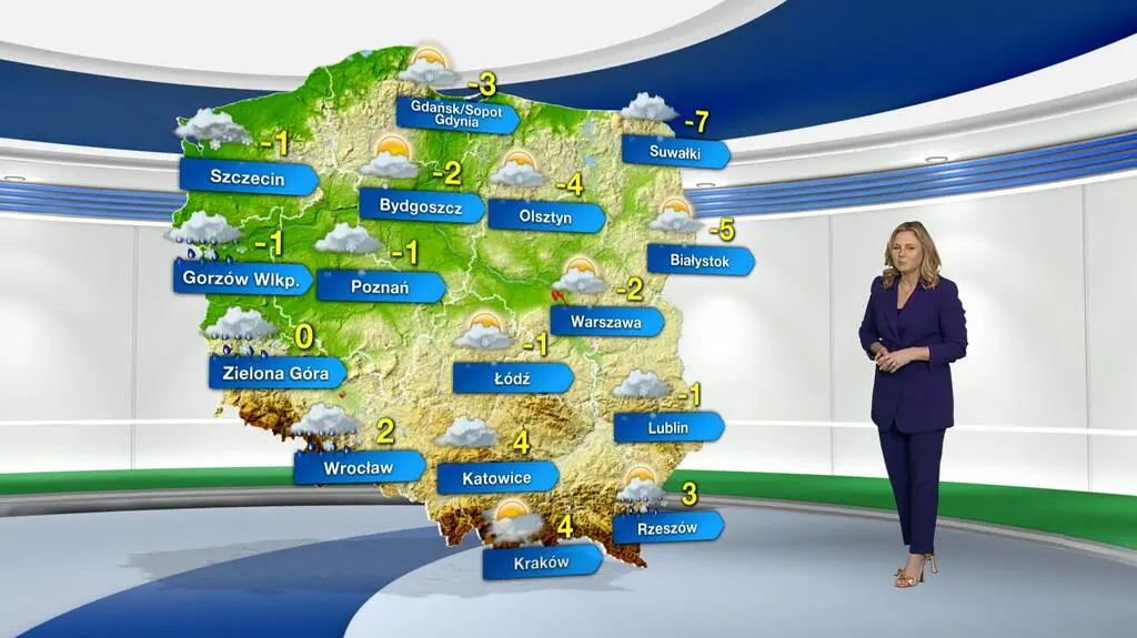 Piątek w całym kraju zapowiada się pochmurno. W ciągu dnia niebo będzie się przejaśniać. Lokalnie może słabo popadać do 1-2 centymetrów śniegu, a w zachodnich regionach Polski - śnieg z deszczem marznącym do 2 litrów na metr kwadratowy. Temperatura maksymalna wyniesie od -7 stopni Celsjusza na Suwalszczyźnie, przez -1 st. C w centrum kraju do 4 st. C na Śląsku i w Małopolsce. Wiatr będzie zmienny, słaby i umiarkowany.