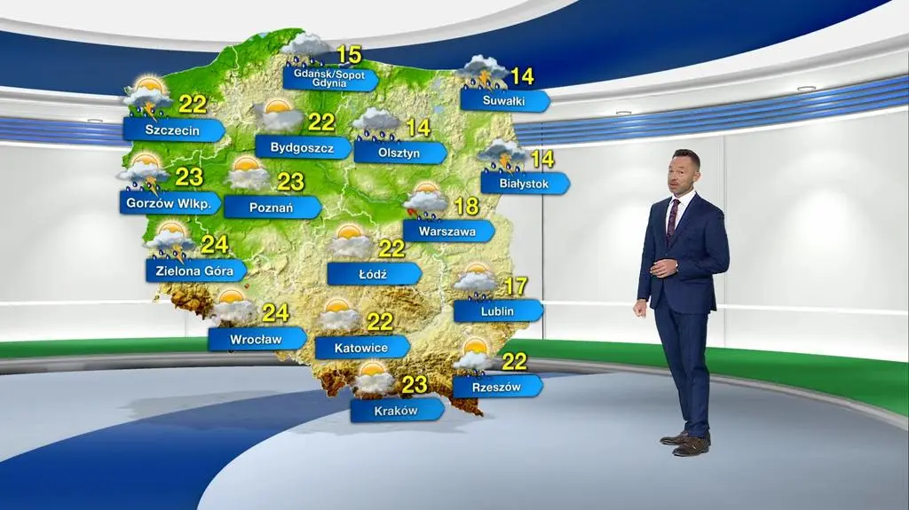 Termometry pokażą od 14 stopni Celsjusza na Suwalszczyźnie, Warmii i Podlasiu, poprzez 22 st. C w centrum kraju, do 24 st. C na Dolnym Śląsku i Ziemi Lubuskiej. Wiatr będzie południowy, słaby i umiarkowany, jedynie podczas burz rozpędzający się do 80 kilometrów na godzinę.