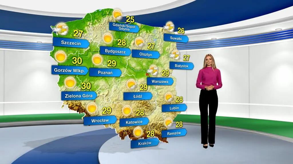 W całej Polsce prognozowany jest słoneczny, pogodny poniedziałek. Temperatura maksymalna wyniesie od 25 stopni Celsjusza na Pomorzu Gdańskim do 30 st. C na Ziemi Lubuskiej. Powieje słaby wiatr z kierunków zachodnich.