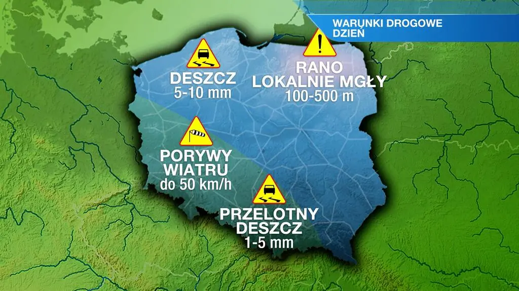 Poniedziałkowy poranek przyniesie silne zamglenia i mgły w północnej i północno-wschodniej Polsce - lokalnie widzialność ograniczona będzie do 100 metrów. Dzień zapowiada się pochmurno, jedynie na południowym zachodzie po południu niebo ma się przejaśniać. W ciągu dnia prognozowane są okresowe opady od 1 do 5 litrów deszczu na metr kwadratowy, lokalnie do 10 l/mkw. Na termometrach zobaczymy od 6 stopni Celsjusza na Suwalszczyźnie do 10 st. C na Dolnym Śląsku. Powieje południowy wiatr, słaby i umiarkowany, na zachodzie okresowo silniejszy z porywami sięgającymi 50 kilometrów na godzinę.