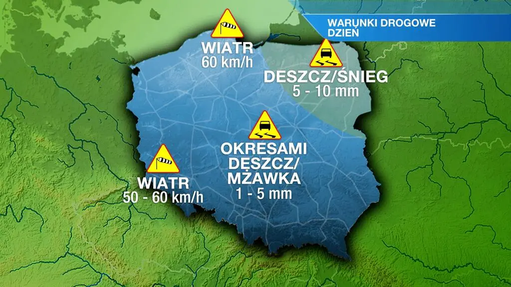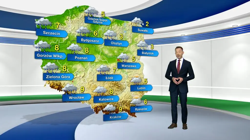 Poniedziałek przyniesie w całym kraju pochmurną aurę. Nad krajem od zachodu przechodzić będzie strefa opadów - spadnie od 5 do 10 litrów deszczu na metr kwadratowy. Na północnym wschodzie popada również deszcz ze śniegiem i mokry śnieg do 5 centymetrów. Temperatura w ciągu dnia wyniesie od 2 stopni Celsjusza w północno-wschodniej Polsce, przez 7 st. C w centrum kraju do 9 st. C na południowym zachodzie i południu. Z kierunków południowych i zachodnich powieje umiarkowany i dość silny wiatr, osiągający w porywach prędkość do 50-60 kilometrów na godzinę.