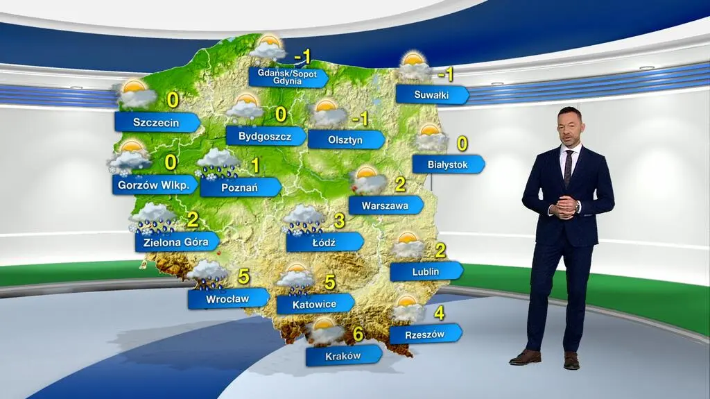 Termometry pokażą od -1 stopni Celsjusza na północnym wschodzie, przez 2-3 st. C w centralnej Polsce, do 6 st. C w Małopolsce. Powieje słaby i umiarkowany wiatr z kierunków zmiennych.