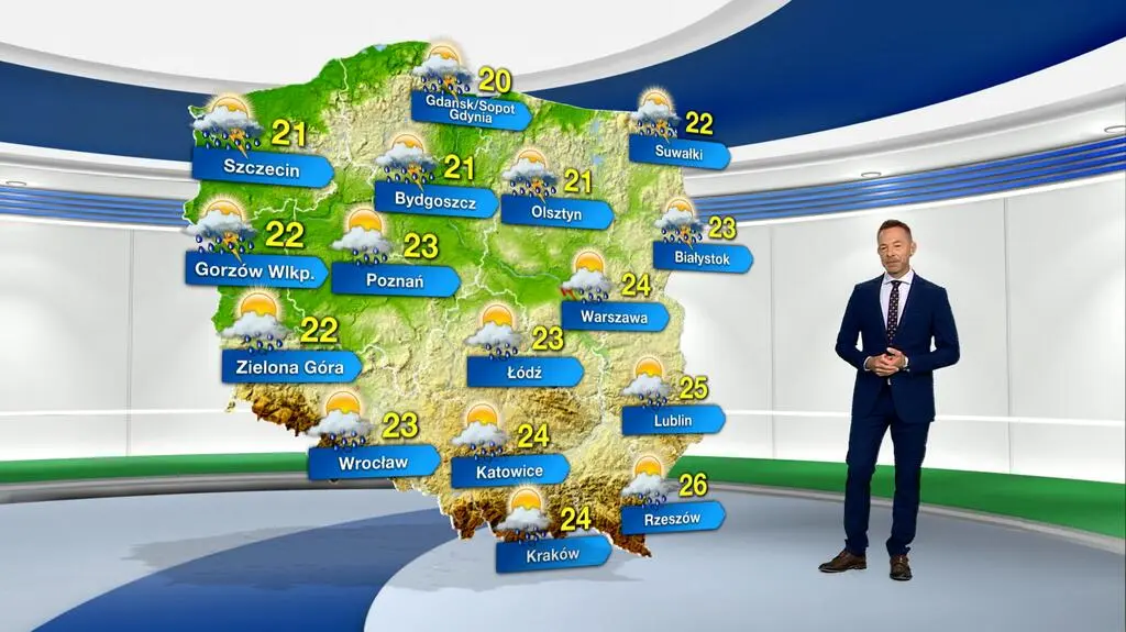Sobota przyniesie zmienne zachmurzenie. Pojawią się przelotne opady deszczu. W północnych regionach wystąpią też burze z opadami rzędu 10-20 litrów wody na metr kwadratowy i wiatrem, który osiągnie w porywach prędkość 60-80 kilometrów na godzinę. Temperatura maksymalna wyniesie od 20 stopni Celsjusza w rejonie Zatoki Gdańskiej do 26 st. C na Podkarpaciu. Powieje słaby i umiarkowany, miejscami silniejszy wiatr, z kierunku zachodniego.
