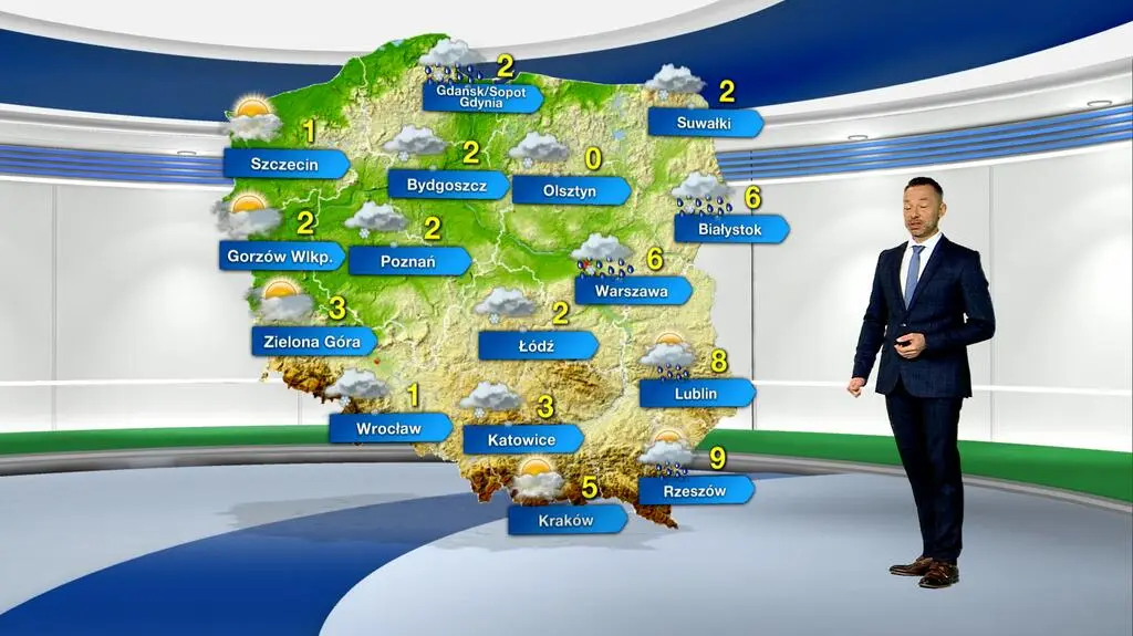 Środa przyniesie pochmurną aurę z przejaśnieniami. Na przeważającym obszarze kraju, głównie na zachodzie, sypnie do 10 centymetrów śniegu. Deszcz ze śniegiem i deszcz pojawi się na wschodzie Polski. Na termometrach zobaczymy maksymalnie od 0 stopni Celsjusza na Warmii do 9 st. C na Podkarpaciu. Powieje słaby i umiarkowany wiatr przeważnie z północy.