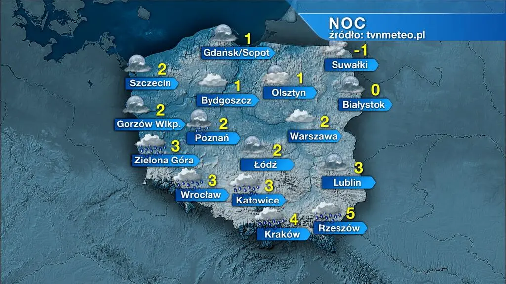 Najbliższa noc zapowiada się pochmurno z przejaśnieniami i rozpogodzeniami. W południowej części kraju popada deszcz, miejscami jego suma może sięgać 10 litrów wody na metr kwadratowy. Temperatura minimalna wyniesie od -1 stopnia Celsjusza na Suwalszczyźnie do 5 st. C na Podkarpaciu. Z zachodu powieje umiarkowany i dość silny wiatr, okresami w porywach może rozpędzać się do 40-60 kilometrów na godzinę.