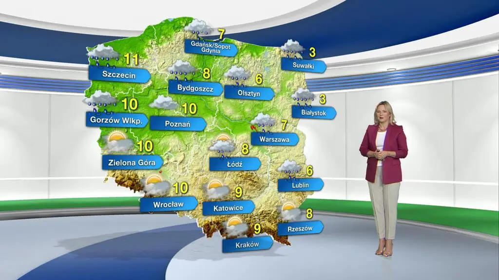 Przed nami pochmurna noc ze słabymi opadami deszczu poniżej jednego litra wody na metr kwadratowy, które będą się przemieszczać z północnego zachodu na południowy wschód kraju. Przejaśnienia możliwe są na północnym wschodzie oraz na południowym zachodzie kraju. Lokalnie w pasie od Pomorza Zachodniego, poprzez centrum kraju, po Podkarpacie mogą wystąpić silne zamglenia i mgły. Temperatura minimalna wyniesie od -2 stopni Celsjusza na Podlasiu i Suwalszczyźnie, przez 5-6 st. C w centrum, do 7 st. C na północnym zachodzie. Powieje słaby wiatr, na wschodzie północno-wschodni, a na zachodzie południowo-zachodni.