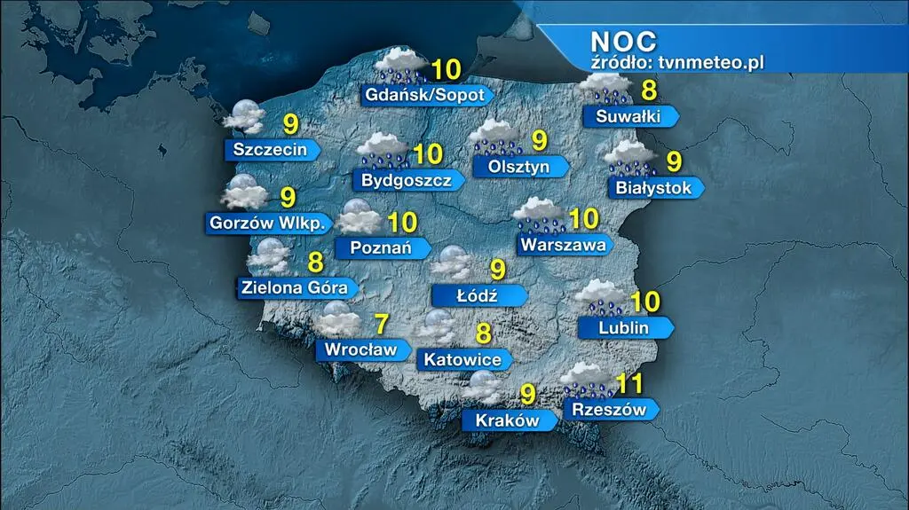 W nocy na Pomorzu Gdańskim, Kujawach, Warmii, Mazurach, Podlasiu, Mazowszu, Lubelszczyźnie i Podkarpaciu będzie pochmurno z niewielkim deszczem o sumie 1-5 litrów wody na metr kwadratowy. Pozostałym regionom kraju dopisze pogodna aura. Miejscami, zwłaszcza w centrum, prognozuje się mgły ograniczające widzialność do 200-400 metrów. Temperatura minimalna wyniesie od 8 stopni Celsjusza na Suwalszczyźnie do 11 st. C na Podkarpaciu. Powieje słaby i umiarkowany wiatr z zachodu.