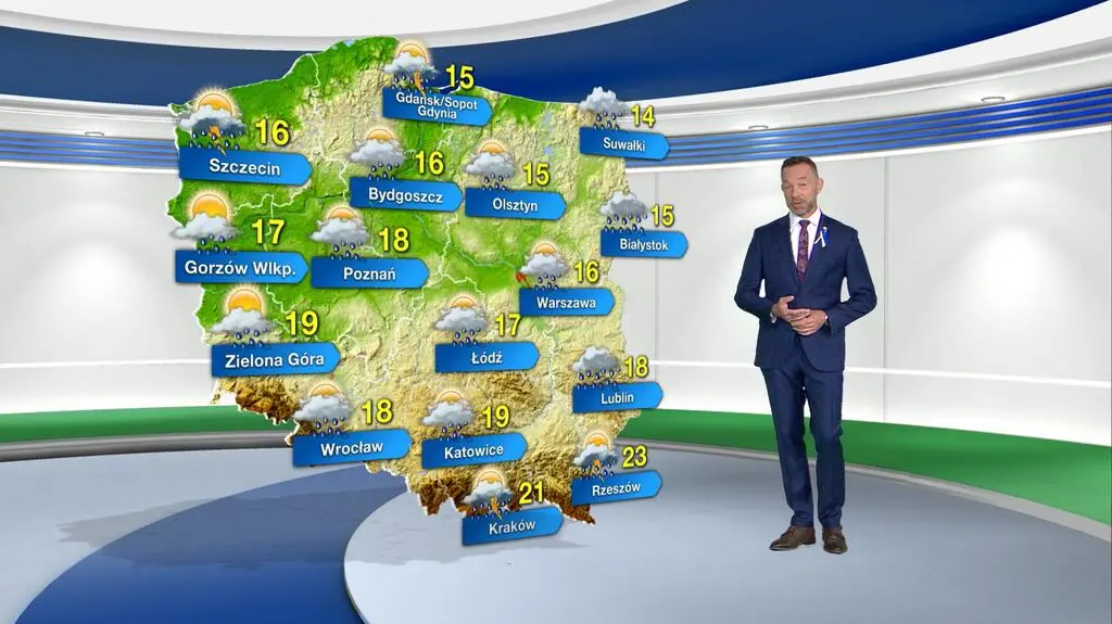 Dzień w Warszawie będzie pochmurny z opadami deszczu dość obfitymi, po południu prognozuje się przejaśnienia i słabnące opady. Termometry pokażą maksymalnie 16 st. C. Zachodni wiatr, umiarkowany i dość silny, w porywach rozpędzi się do 50-60 km/h. W południe na barometrach zobaczymy 997 hPa.