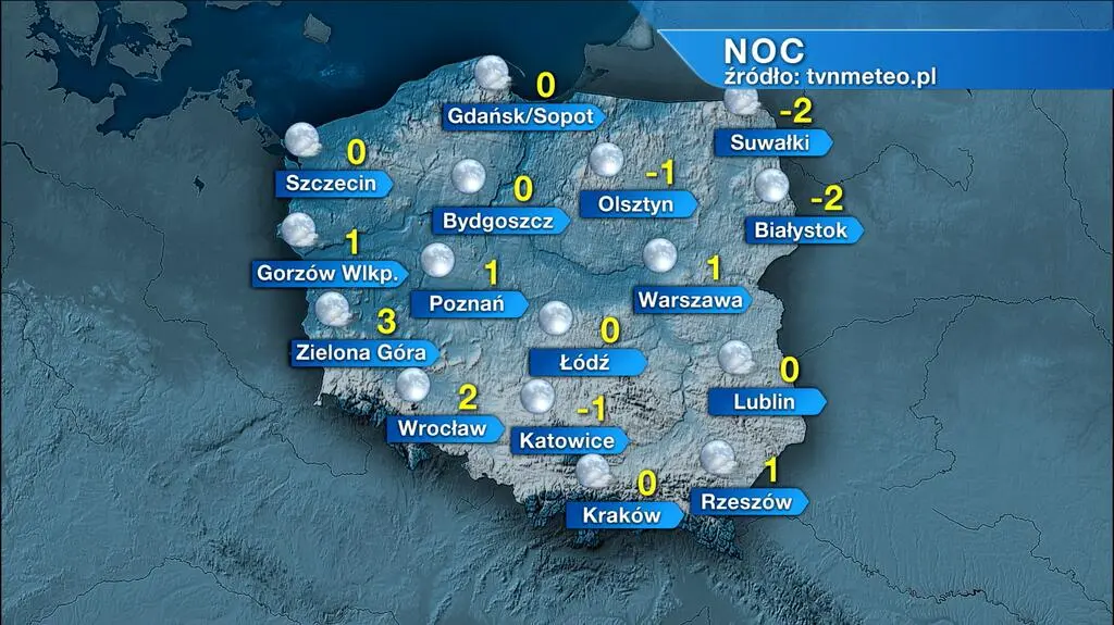 Noc w całym kraju zapowiada się pogodnie, jedynie lokalnie mogą wystąpić mgły. Termometry wskażą od -2 stopni Celsjusza na Podlasiu, przez 0 st. C w centrum kraju do 3 st. C na Ziemi Lubuskiej. Północny i wschodni wiatr okaże się słaby i umiarkowany.