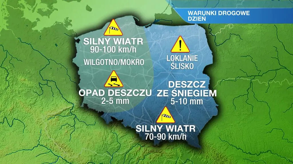 W nocy z niedzieli na poniedziałek (16/17.01) niebo będzie przeważnie pochmurne. Wystąpią słabe opady deszczu, na wschodzie i południu również deszczu ze śniegiem do dwóch litrów wody na metr kwadratowy. Nad ranem na północy kraju prognozuje się umiarkowane opady deszczu. Temperatura minimalna wyniesie od -1 stopnia Celsjusza na wschodzie do 3-4 st. C na zachodzie kraju. Zachodni wiatr początkowo będzie umiarkowany, w drugiej części nocy na Wybrzeżu bardzo silny, osiągający w porywach do 90-110 kilometrów na godzinę. W głębi kraju rozpędzi się do 70-90 km/h.