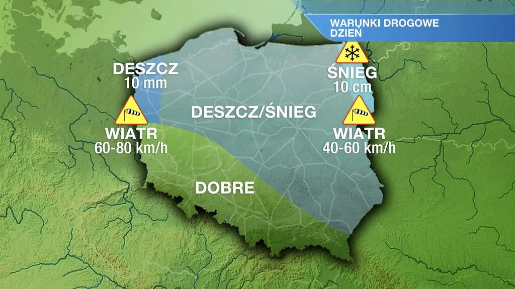 Poniedziałek przyniesie nam duże zachmurzenie w całym kraju. Wystąpią także opady śniegu, w regionach północnych miejscami spadnie go więcej niż 10 centymetrów. Stopniowo będą przechodzić w deszcz ze śniegiem i deszcz. Lokalnie możliwe są zawieje śnieżne. Temperatura maksymalna sięgnie od 2 st. C na Podlasiu do 12 st. C na Dolnym Śląsku. Z południowego zachodu powieje silny i porywisty wiatr. Okresami w porywach będzie osiągał 60-90 km/h. W strefie brzegowej porywy mogą przekraczać 100 km/h. Na Bałtyku możliwy jest sztorm o sile 8-9 w skali Beauforta.