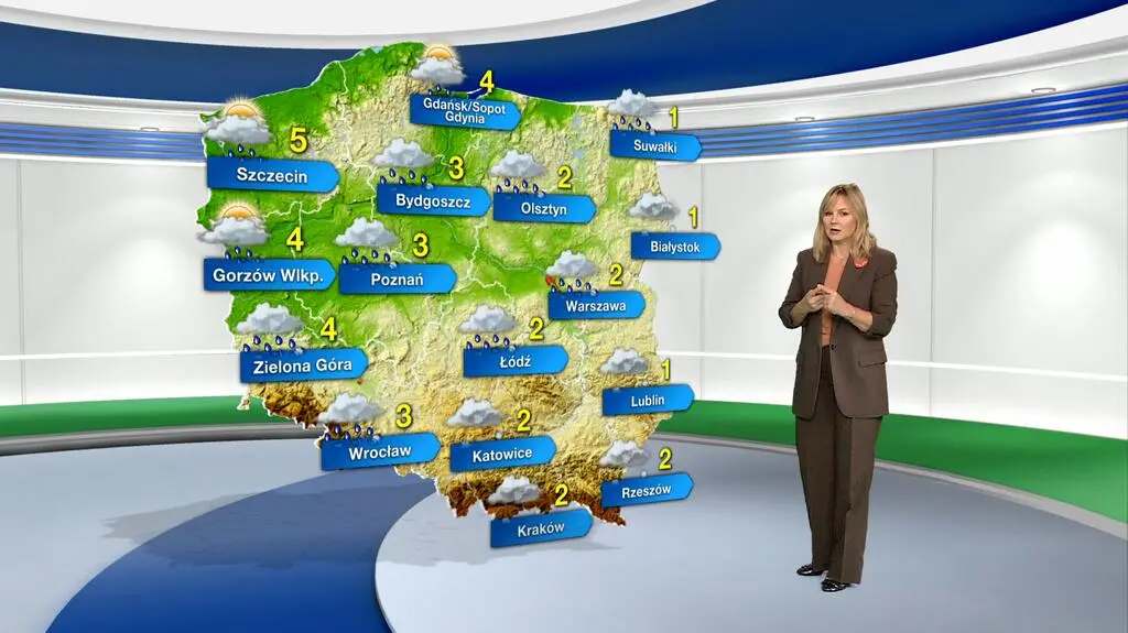 W poniedziałek wystąpią przemieszczające się z północnego zachodu na południowy wschód opady mokrego śniegu. Spadnie go do 3-5 centymetrów, lokalnie 5-10 cm. Opady te przechodzić będą w deszcz ze śniegiem i deszcz. Na północnym zachodzie Polski, w drugiej części dnia, prognozuje się przejaśnienia, lokalnie rozpogodzenia. Termometry pokażą maksymalnie od 1 st. C w regionach wschodnich, przez 2 st. C w centrum kraju, do 5 st. C na Pomorzu Zachodnim. Zachodni, umiarkowany i dość silny wiatr w porywach osiągnie do 50-70 kilometrów na godzinę. Na wybrzeżu porywy osiągną do 80 km/h. We wschodniej część kraju lokalnie możliwe są zawieje śnieżne.