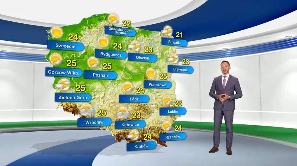 Poniedziałek upłynie pod znakiem słonecznej aury. W drugiej części dnia prognozuje się wzrost zachmurzenia na południu kraju. Pod koniec dnia lokalnie na krańcach południowych i południowo-zachodnich pojawi się słaby, przelotny opad deszczu o sumie 1-5 litrów wody na metr kwadratowy. Na termometrach zobaczymy maksymalnie od 21-23 st. C na Suwalszczyźnie do 24-25 st. C na pozostałym obszarze kraju. Wiatr będzie słaby i umiarkowany, zmienny.