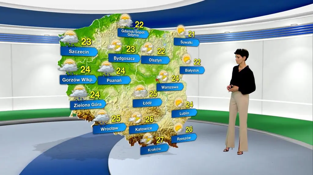 Poniedziałek w województwach zachodnich będzie pochmurny, spodziewane są też opady deszczu do 5-10 litrów wody na metr kwadratowy. Lokalnie, szczególnie na Ziemi Lubuskiej i w Wielkopolsce wystąpią burze, którym towarzyszyć będą opady rzędu 10-20 l/mkw. oraz porywy wiatru do 60-80 km/h. W pozostałej części kraju zachmurzenie będzie umiarkowane i duże. Temperatura maksymalna sięgnie od 21 st. C na Suwalszczyźnie do 27 st. C w Małopolsce. Powieje słaby i umiarkowany, południowo-wschodni wiatr.