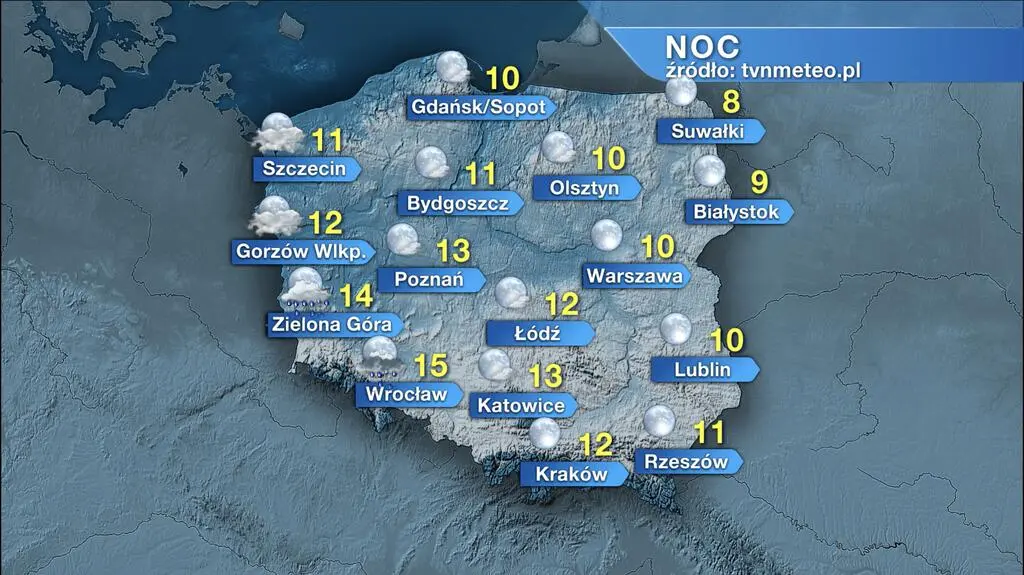 Nadchodząca noc zapowiada się pogodnie. Na Dolnym Śląsku i Ziemi Lubuskiej po północy spodziewany jest deszcz. Temperatura minimalna sięgnie od 8 stopni Celsjusza na Suwalszczyźnie do 15 st. C na Dolnym Śląsku. Powieje słaby i umiarkowany, południowo-wschodni wiatr.