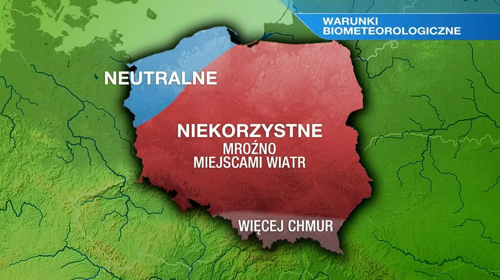 Wilgotność powietrza w ciągu dnia wyniesie od 60 do ponad 80 procent, z czego najwyższa spodziewana jest na południu kraju. W większości regionów odczujemy zimno - mroźno będzie na północnym wschodzie, a chłodno na północnym zachodzie. Warunki biometeorologiczne okażą się przeważnie niekorzystne, neutralne jedynie w północno-zachodniej Polsce.