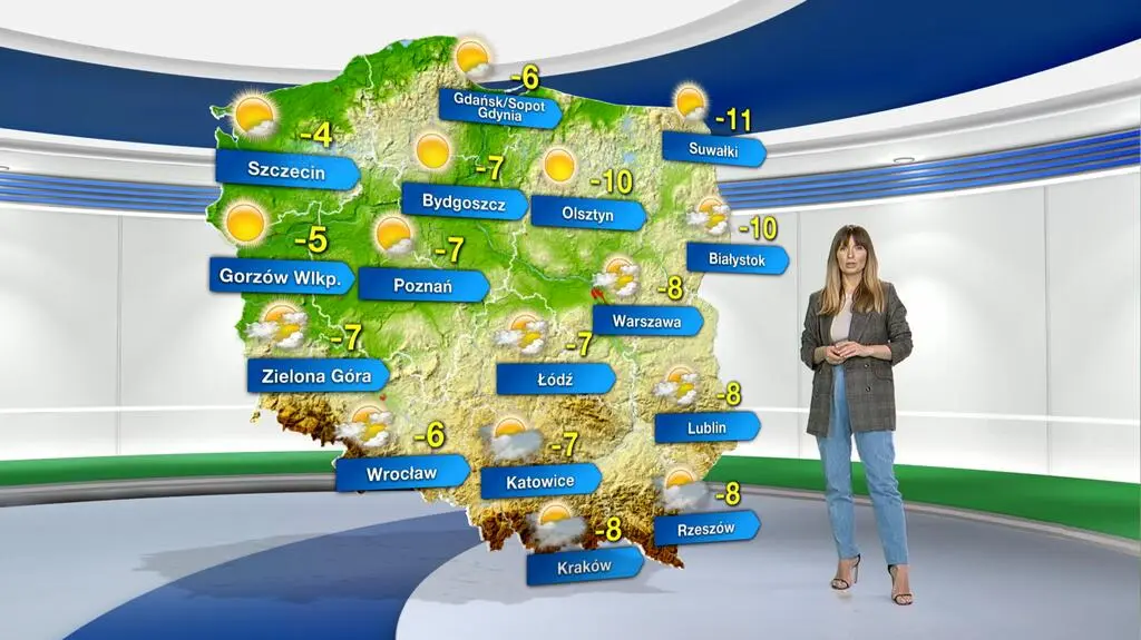 Poniedziałek w większości kraju będzie pogodny, miejscami nawet słoneczny. Większe zachmurzenie spodziewane jest jedynie na południu i południowym wschodzie kraju. Lokalnie, zwłaszcza na obszarach podgórskich, mogą występować tam opady śniegu. Termometry wskażą od -11 st. C na Suwalszczyźnie do -4 st. C na Nizinie Szczecińskiej. Powieje słaby i umiarkowany, północno-wschodni wiatr.