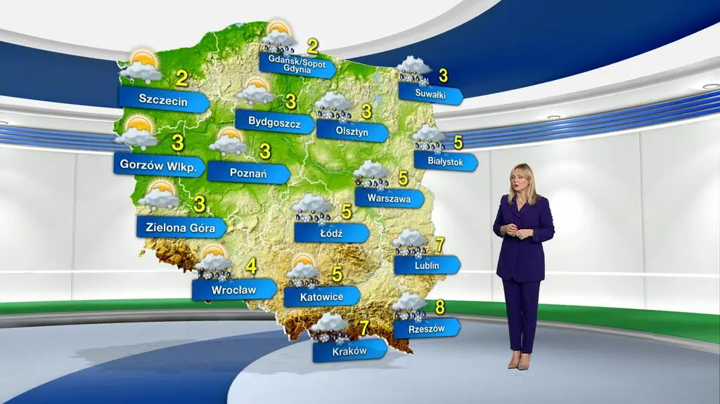 Termometry pokażą od 0 stopni Celsjusza na Ziemi Lubuskiej, Pomorzu, Warmii, Mazurach i Suwalszczyźnie, przez 2-3 st. C w centrum kraju do 6 st. C na Podkarpaciu i Lubelszczyźnie. Wiatr będzie południowo-zachodni, skręcający na północno-zachodni. Podmuchy okażą się umiarkowane, okresami dość silne, w porywach rozwijające prędkość do 50-60 kilometrów na godzinę. W górach powieje silniej, do 80-90 km/h.