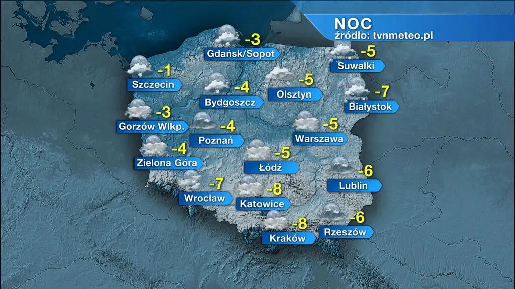 W nocy będzie pogodnie. Tylko na północy kraju będzie pochmurno i okresami wystąpią opady śniegu do pięciu centymetrów. Temperatura minimalna wyniesie od -8 stopni Celsjusza na Górnym Śląsku i w Małopolsce, przez -5 st. C w centrum kraju, do -1 st. C na Pomorzu Zachodnim. Wiatr będzie zachodni i południowo zachodni, umiarkowany, okresami dość silny, w porywach osiągnie do 60-80 kilometrów na godzinę, a nad morzem do 90 km/h.