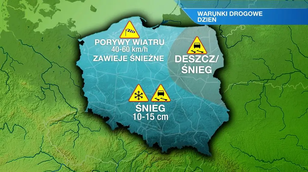 Najbliższa noc przyniesie umiarkowane i intensywne opady śniegu, których strefa przemieszczać się będzie od Podkarpacia w kierunku centrum kraju i nad ranem dotrze do linii Wrocław - Łódź - Suwałki. Prognozowana suma opadów w ciągu nocy sięgnie 5-10 cm śniegu. W górach pokrywa zwiększy się o 10-15 cm. Temperatura minimalna sięgnie od -3/-2 stopni Celsjusza na północy i zachodzie do -2/-1 st. C na wschodzie i południu Polski. Wiatr z północnego wschodu będzie umiarkowany. Na wschodzie, północy oraz nad ranem w centrum będzie wiać porywiście - do 40-60 kilometrów na godzinę, co przyczyni się do powstawania zawiei śnieżne. Warunki na drogach będą bardzo trudne.
