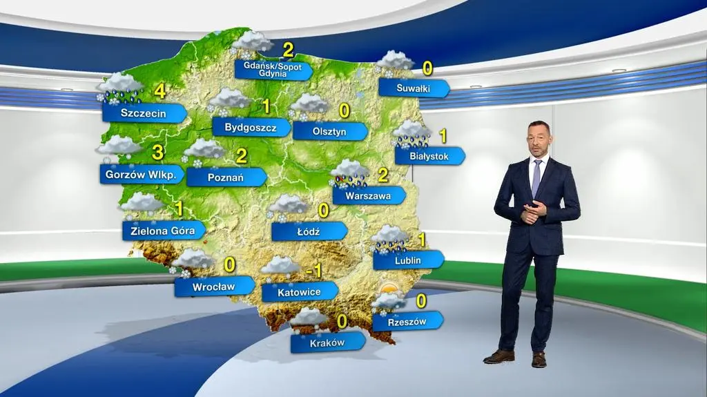Sobota upłynie pod znakiem pochmurnego nieba oraz umiarkowanych i intensywnych opadów śniegu, a na wschodzie również deszczu ze śniegiem i deszczu, które przemieszczać się będą ze wschodu na zachód. W drugiej części dnia na Podkarpaciu i Lubelszczyźnie padać przestanie, możliwe są przejaśnienia. Przez 24 godziny na zachodzie i północy może dopadać 5-10 cm śniegu, a w pozostałych regionach do 10-15 cm. Lokalnie w centrum i na południu pojawić się może 20 cm opadu. Na termometrach zobaczymy od -1/1 st. C na południu, wschodzie i w centrum do 2/4 st. C na północnym zachodzie Polski. Wiatr powieje umiarkowanie, ale w porywach - szczególnie w północnej połowie kraju - może być silny i osiągać 40-50 kilometrów na godzinę, co przyczyni się do powstawania zawiei śnieżnych. Na Wybrzeżu możemy spodziewać się porywów do 70 km/h.