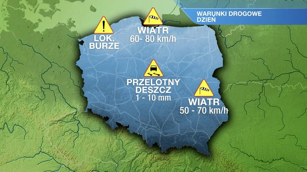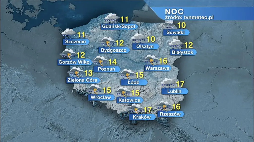 W nocy z piątku na sobotę 20/21.05 wystąpi duże zachmurzenie. Prognozuje się przemieszczającą się z zachodu na wschód strefę intensywnych opadów deszczu i burz, lokalnie gwałtownych, z opadami do 20-30 litrów wody na metr kwadratowy. Temperatura minimalna wyniesie od 10 stopni Celsjusza na Suwalszczyźnie, przez 15 st. C w centrum kraju, do 17 st. C w Małopolsce i na Lubelszczyźnie. Powieje południowo-zachodni i zachodni, umiarkowany i dość silny wiatr. W porywach burzowych rozpędzi się do 70-90 kilometrów na godzinę, lokalnie możliwe silniejsze pojedyncze porywy.