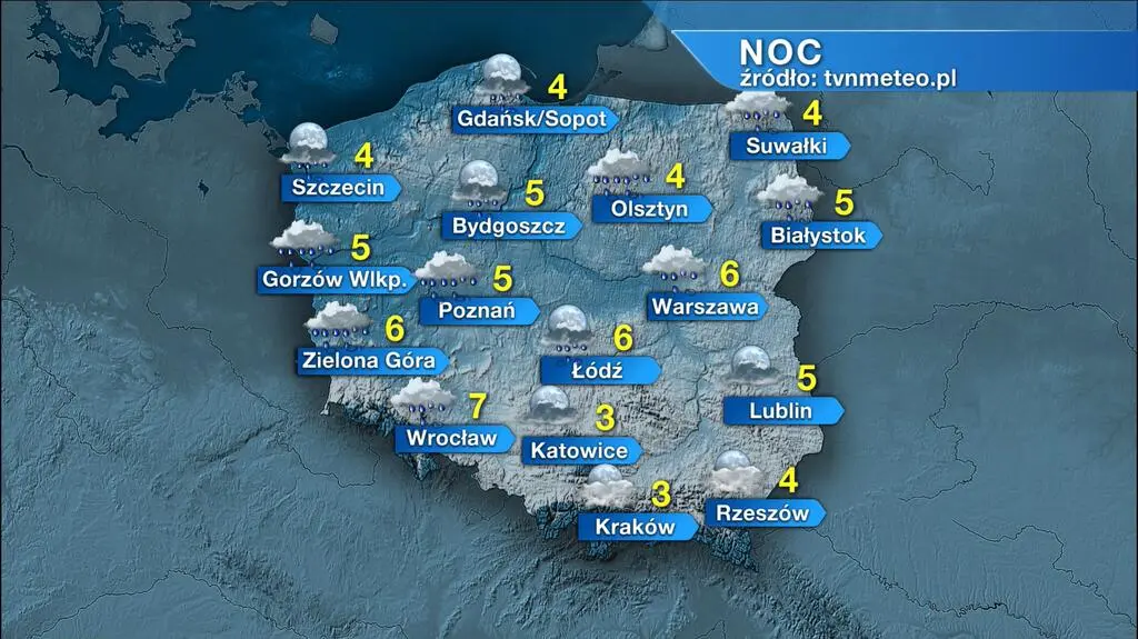 Nadchodząca noc zapowiada się pochmurno z większymi przejaśnieniami na południowym wschodzie kraju. Na północy, zachodzie i w centrum kraju okresami wystąpią opady deszczu do 5 litrów na metr kwadratowy. Temperatura minimalna wyniesie od 3 stopni Celsjusza na Górnym Śląsku i w Małopolsce, przez 6 st. C w centrum kraju, do 7 st. C na Dolnym Śląsku. Wiatr będzie południowo zachodni, umiarkowany i dość silny, w porywach rozpędzając się do 60-80 kilometrów na godzinę, w górach powyżej 100 km/h.