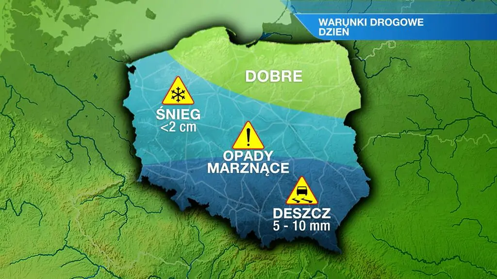 Uwaga, w nocy z piątku na sobotę warunki na drogach będą trudne, ponieważ w pasie od Ziemi Lubuskiej, przez Ziemię Łódzką i Świętokrzyską, po Lubelszczyznę wystąpią marznące opady powodujące gołoledź.