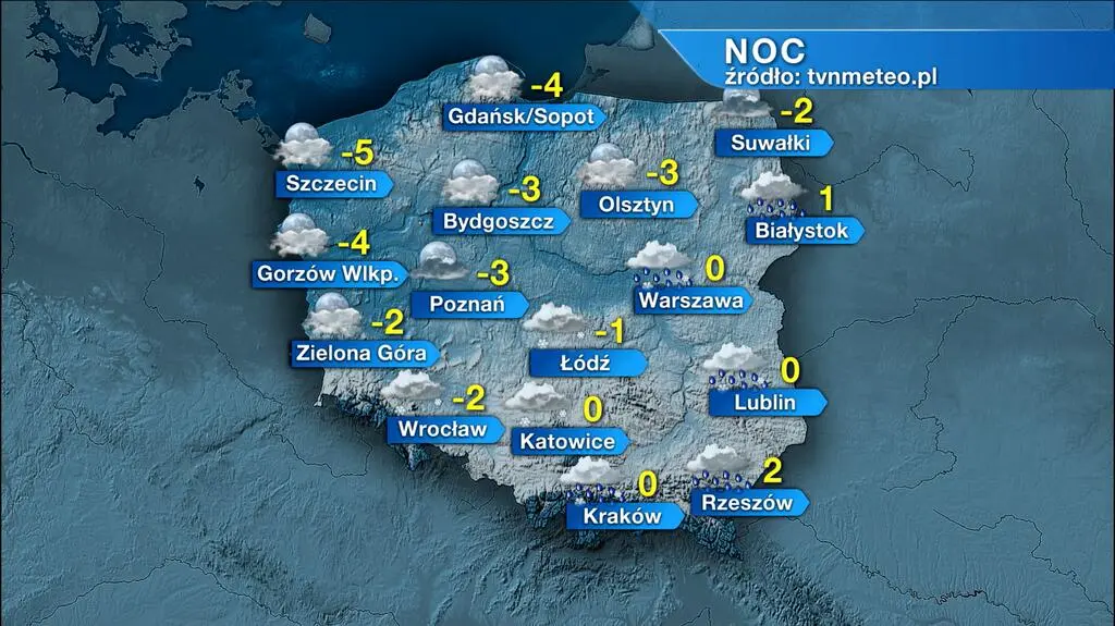 Noc zapowiada się ogół pogodnie w województwach północno-zachodnich. W południowo-wschodniej części kraju przeważnie będzie pochmurno i popada śnieg, deszcz ze śniegiem i deszcz. Zrobi się ślisko. Temperatura minimalna wyniesie od -5 stopni Celsjusza na Nizinie Szczecińskiej do 2 st. C na Podkarpaciu. Powieje słaby i umiarkowany, miejscami silniejszy, przeważnie wschodni wiatr.