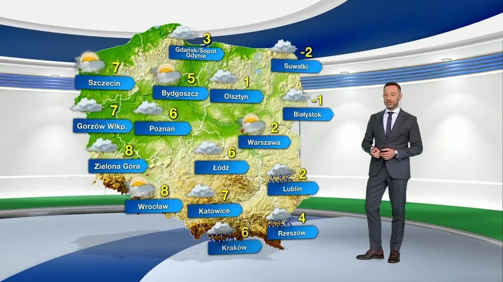 Środa upłynie pod znakiem dużego zachmurzenia z przejaśnieniami. W południowo-wschodniej części kraju miejscami popada słaby deszcz. Temperatura maksymalna sięgnie od -2 st. C na Podlasiu do 8 st. C na Dolnym Śląsku. Powieje słaby i umiarkowany wiatr ze zmiennych kierunków.