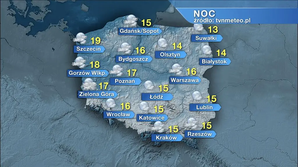 W nocy z wtorku na środę będzie pogodnie. Temperatura minimalna wyniesie od 13 stopni Celsjusza na Suwalczanie, przez 15 st. C w centrum kraju, do 19 st. C na Pomorzu Zachodnim. Powieje zmienny, słaby wiatr.