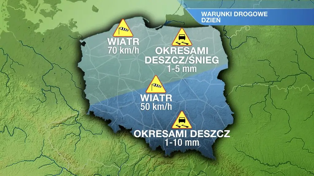 Przed nami pochmurna noc, okresami wystąpią opady deszczu do 5-10 litrów wody na metr kwadratowy, przechodzące na Pomorzu i Kujawach w deszcz ze śniegiem. Temperatura minimalna wyniesie od 1 stopnia Celsjusza na Pomorzu i Warmii, przez 4 st. C w centrum kraju, do 6 st. C na Podkarpaciu. Południowo-zachodni i zachodni wiatr będzie słaby i umiarkowany, okresami dość silny, w porywach rozpędzi się do 60 kilometrów na godzinę. Na południu porywy mogą sięgać do 80 km/h.