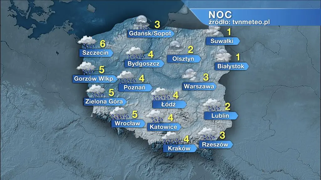 Pochmurno z opadami deszczu. Temperatura minimalna wyniesie 3 st. C. Powieje umiarkowany i dość silny, zachodni wiatr, okresami w porywach do 40-60 km/h. Ciśnienie o północy osiągnie 1017 hPa.