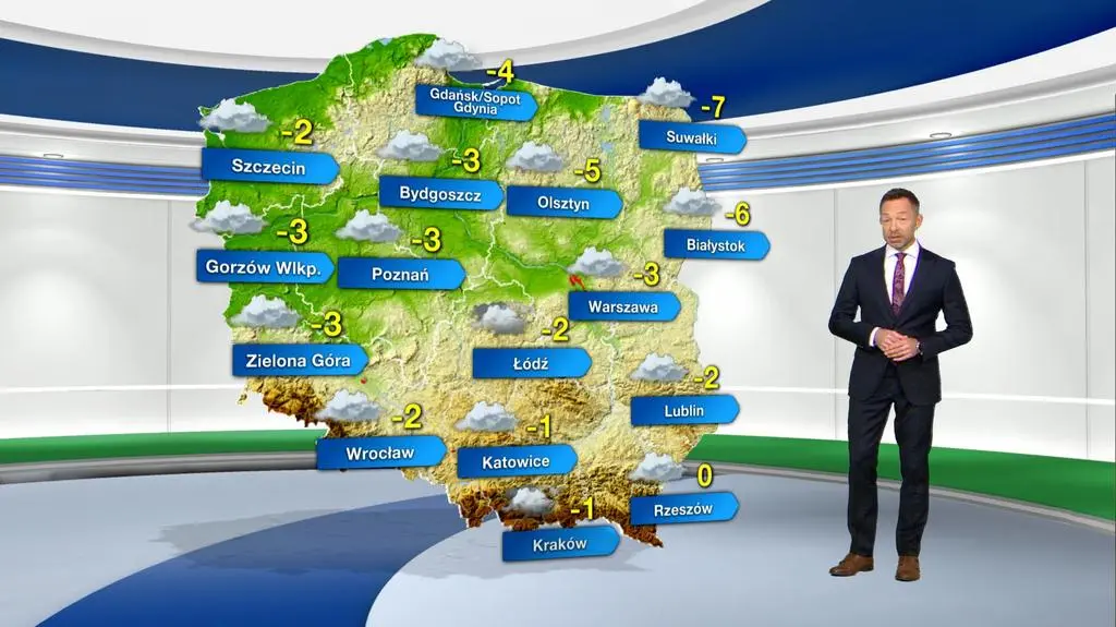 Dzień upłynie pod znakiem dużego zachmurzenia, niebo tylko nieznacznie może się przejaśniać. Miejscami słabo popada śnieg. Na termometrach zobaczymy maksymalnie od -7 st. C na Suwalszczyźnie do 0 st. C na Podkarpaciu. Wiatr będzie słaby i umiarkowany, w niektórych miejscach silniejszy. Powieje z kierunku północno-wschodniego, skręcając na południowo-wschodni.