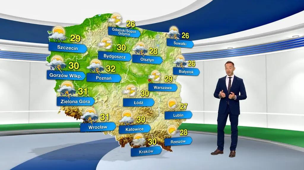 Wtorek przyniesie początkowo pogodną aurę. W drugiej części dnia zachmurzenie wzrośnie na zachodzie kraju, lokalnie pojawią się tam pojedyncze burze. Podczas wyładowań spadnie intensywny deszcz o sumie 20-30 litrów na metr kwadratowy. Może też pojawić się grad. Słabe burze mogą wystąpić również w północno-wschodniej części Polski. Na termometrach zobaczymy od 26-27 st. C na Pomorzu i Suwalszczyźnie, przez 28-30 st. C w centrum kraju, do 30-32 st. C na zachodzie Polski. Powieje słaby, zmienny wiatr.