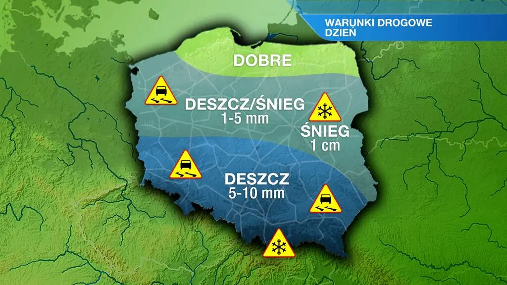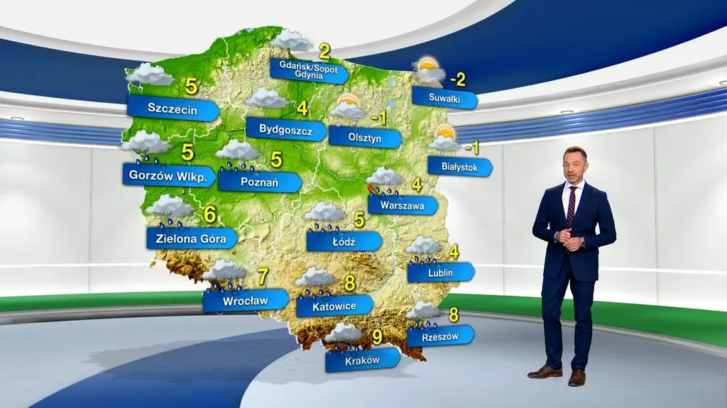 Noc zapowiada się pochmurno, jednak na północy kraju niebo będzie się przejaśniać. W południowych i południowo-zachodnich regionach spodziewane są opady do 10-20 litrów deszczu na metr kwadratowy, poza tym słabe opady deszczu ze śniegiem do 1-5 l/mkw., a na północnym wschodzie - słabe opady śniegu do 1 centymetra. Termometry pokażą od -5 stopni Celsjusza na Suwalszczyźnie, przez 3 st. C w centralnej Polsce do 7 st. C w Małopolsce. Ze wschodu i północy powieje słaby i umiarkowany wiatr.