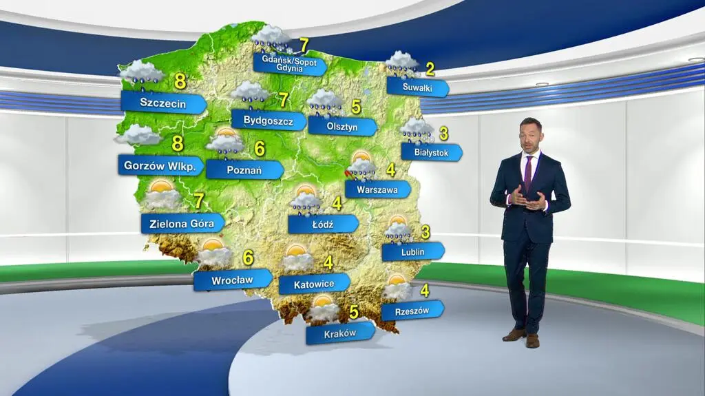 Wtorek upłynie pod znakiem pochmurnej aury z przejaśnieniami, na południu z rozpogodzeniami. Na północy, wschodzie i w centrum Polski popada słaby deszcz i deszcz ze śniegiem do 1-5 litrów wody na metr kwadratowy. Na Podlasiu wystąpią słabe opady śniegu. Na termometrach zobaczymy maksymalnie od 2 st. C na Suwalszczyźnie, przez 4 st. C w centrum kraju, do 8 st. C na Pomorzu Zachodnim. Zachodni wiatr, umiarkowany, okresami dość silny, w porywach osiągnie prędkość do 50 kilometrów na godzinie na wschodzie kraju.