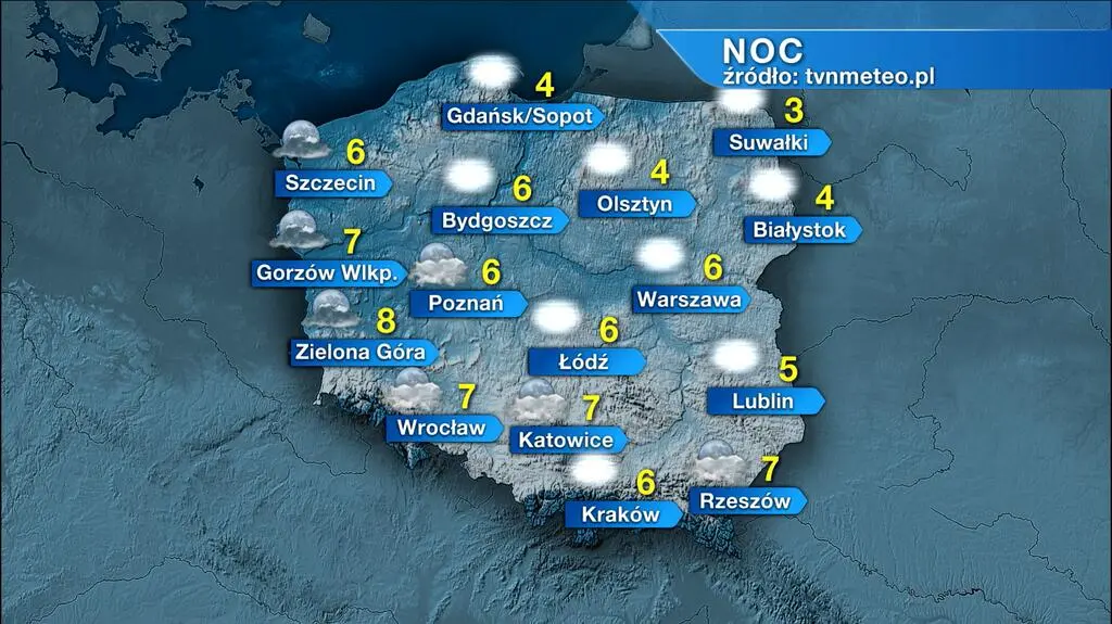 Noc zapowiada się początkowo pogodnie. Potem na północy, wschodzie oraz w centrum kraju pojawią się gęste mgły ograniczające widzialność do 100-200 metrów i towarzyszące im niskie zachmurzenie. Warunki na drogach w tych regionach będą bardzo trudne, zwłaszcza w drugiej części nocy i nad ranem. Termometry wskażą minimalnie od 3 stopni Celsjusza na Suwalszczyźnie do 8 st. C na Ziemi Lubuskiej. Powieje słaby, przeważnie zmienny, jedynie na zachodzie południowo-zachodni.
