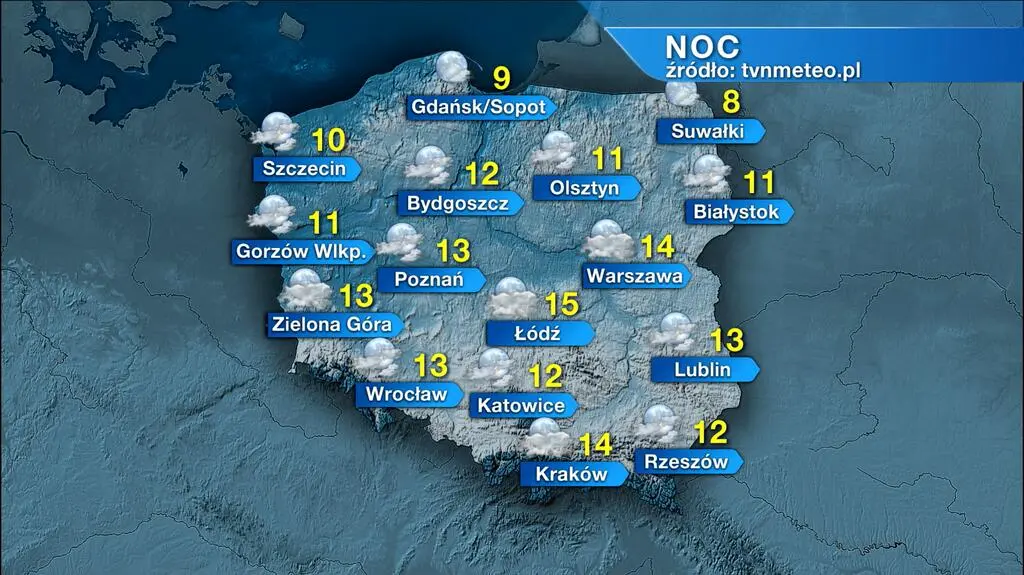 W nocy w całym kraju wystąpi małe i umiarkowane zachmurzenie, a lokalnie mogą snuć się mgły. Termometry wskażą od 8 stopni Celsjusza w północno-wschodniej Polsce do 15 st. C w centrum kraju. Powieje słaby wiatr z południowego wschodu.