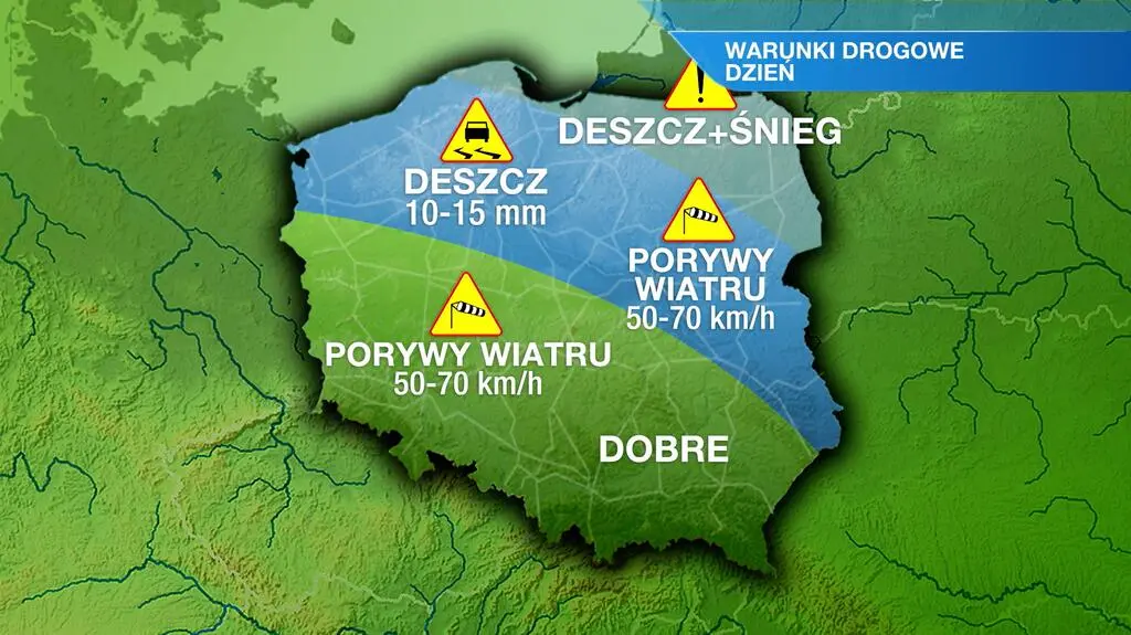 Noc zapowiada się pochmurna. Prognozuje się słabe i umiarkowane, ciągłe opady deszczu o sumie 10-15 litrów wody na metr kwadratowy, które rozciągną się w pasie od Pomorza Zachodniego po Podkarpacie. Przesuwać się będą na wschód i północny wschód. W rejonie Warmii i Mazur, Podlasia, Suwalszczyzny opady deszczu przechodzić będą w deszcz ze śniegiem, a miejscami w mokry śnieg. Temperatura minimalna wyniesie od -1/0 stopni Celsjusza na Suwalszczyźnie do 7-8 st. C na zachodzie kraju. Wiatr umiarkowany, południowo-zachodni, w porywach rozpędzi się do 50-60 kilometrów na godzinę.