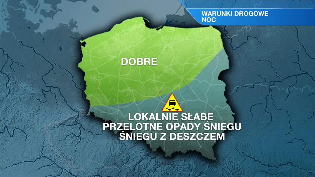 W ciągu nocy z piątku na sobotę warunki drogowe mogą utrudnione na południu, częściowo w centrum i na wschodzie kraju. Będzie tam pochmurno z lokalnymi słabymi opadami śniegu. Miejscami możliwy jest również deszcz ze śniegiem.