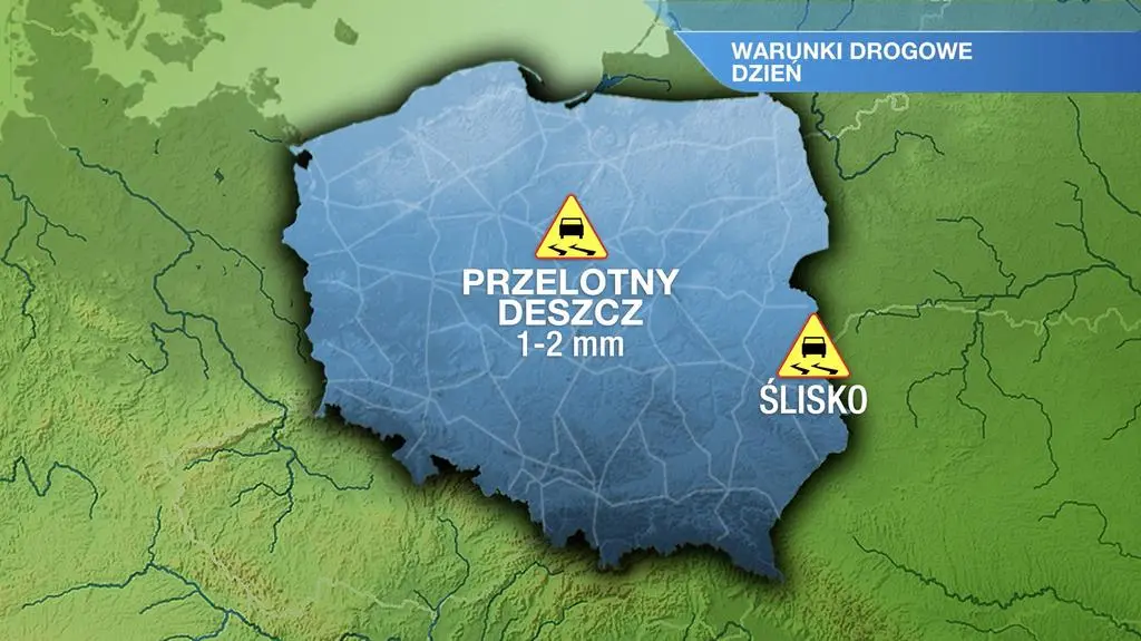 Warunki drogowe w ciągu dnia będą trudne na obszarze całej Polski. Wszędzie spodziewamy się przelotnych opadów deszczu. Pod koniec dnia na północy kraju może popadać również deszcz ze śniegiem.