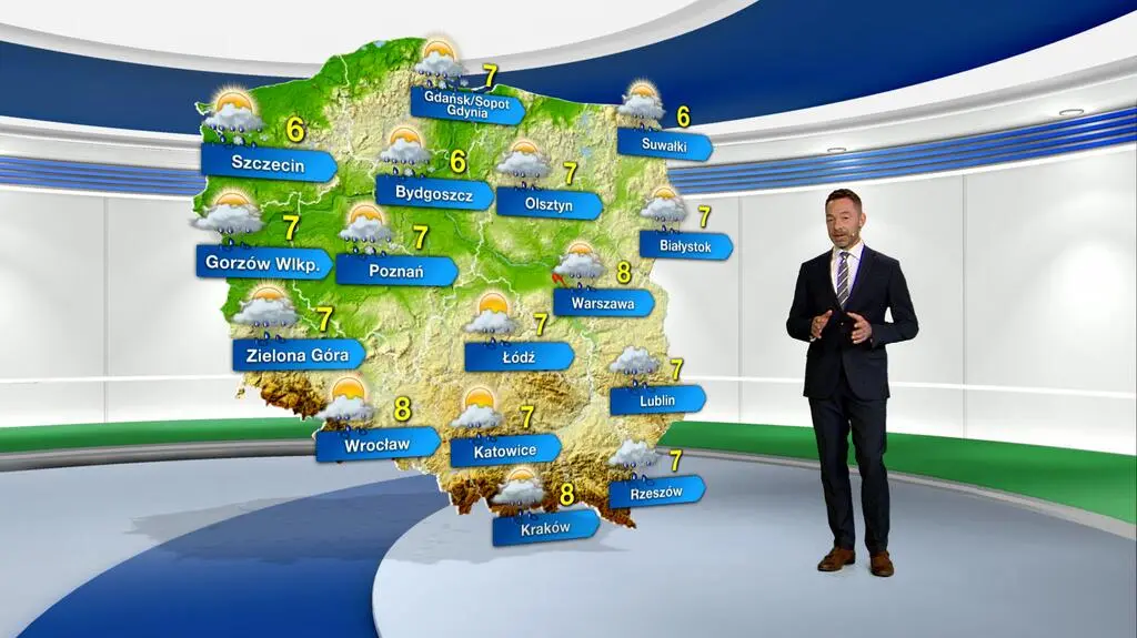 Poniedziałek początkowo w niemal całym kraju upłynie pod znakiem całkowitego zachmurzenia z postępującymi w ciągu dnia przejaśnieniami i rozpogodzeniami. Po południu na zachodzie i północy zachmurzenie ponownie wzrośnie do całkowitego. Wszędzie popada deszcz, na zachodzie i północy również deszcz ze śniegiem. Istnieje 30-procentowe ryzyko pojawienia się burz. Termometry pokażą maksymalnie 6-8 st. C, przy czym najwyższe wartości temperatury prognozowane są nad ranem. W ciągu dnia temperatura będzie stopniowo spadać. Na zachodzie, północy i w centrum kraju wiatr będzie porywisty, rozpędzi się do 60-80 km/h, pojedyncze porywy mogą sięgać do 90 km/h. W górach i na wybrzeżu powieje do 100 km/h.