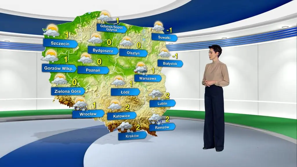 Pogoda na dziś przyniesie nam duże zachmurzenie z większymi przejaśnieniami. Wystąpią przelotne opady śniegu do 1-5 centymetrów, w górach - do 10 cm. Początkowo, szczególnie na południu, pojawią się również opady deszczu ze śniegiem. Na termometrach zobaczymy maksymalnie od -1 stopnia Celsjusza na północnym wschodzie kraju do 2 st. C na Podkarpaciu. Zachodni i północno-zachodni wiatr będzie silny - w porywach może rozpędzać się do 50-70 kilometrów na godzinę. W niektórych miejscach na południu porywy mogą sięgać jednak do 90 km/h, a na Wybrzeżu - do 100 km/h.