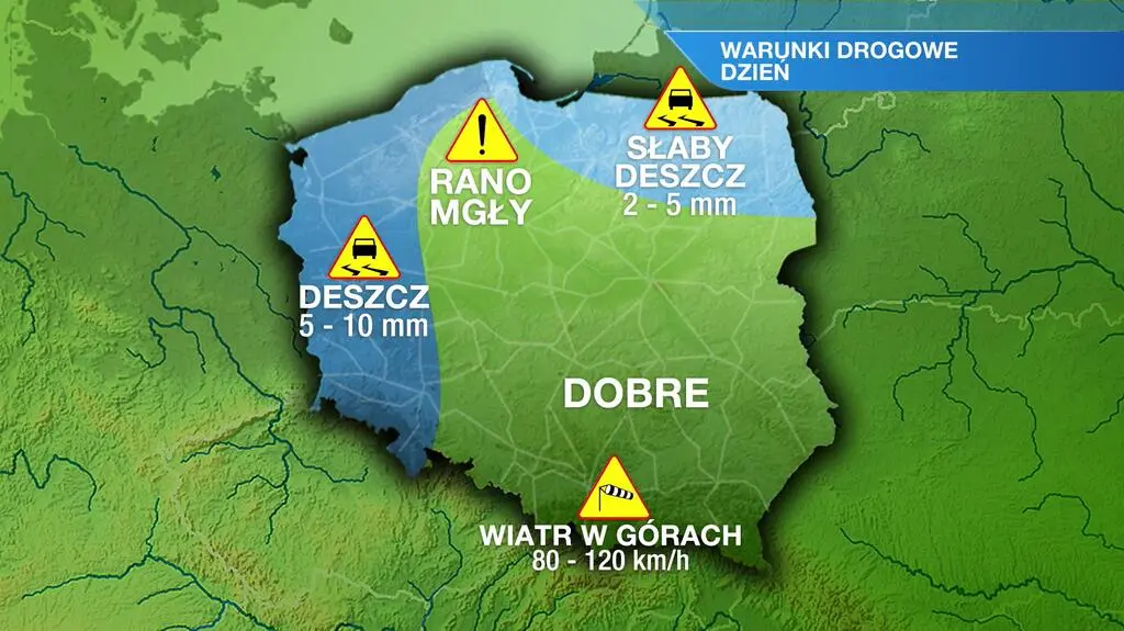 Czwartek przyniesie początkowo na północnym wschodzie kraju duże zachmurzenie i słabe opady deszczu o sumie 2-5 litrów na metr kwadratowy. Chmury stopniowo odsuną się jednak poza Polskę. W pasie północnym prognozowane są znaczne ograniczenia widzialności przez silne zamglenia i mgły oraz towarzyszące im całkowite zachmurzenie. Na zachodzie w ciągu dnia zachmurzenie wzrośnie do całkowitego, a około południa zacznie padać - suma opadów wyniesie do 5-10 l/mkw. W pozostałych regionach dopisze pogodna aura. Termometry pokażą maksymalnie od 11-13 stopni Celsjusza na Podlasiu, przez 17 st. C w centrum, do 19-20 st. C na południu. Powieje umiarkowany, okresami dość silny wiatr z kierunków południowych. W porywach rozpędzi się do 30-50 kilometrów na godzinę, w górach - do 80-100 km/h, a w szczytowych partiach - nawet do 120 km/h.