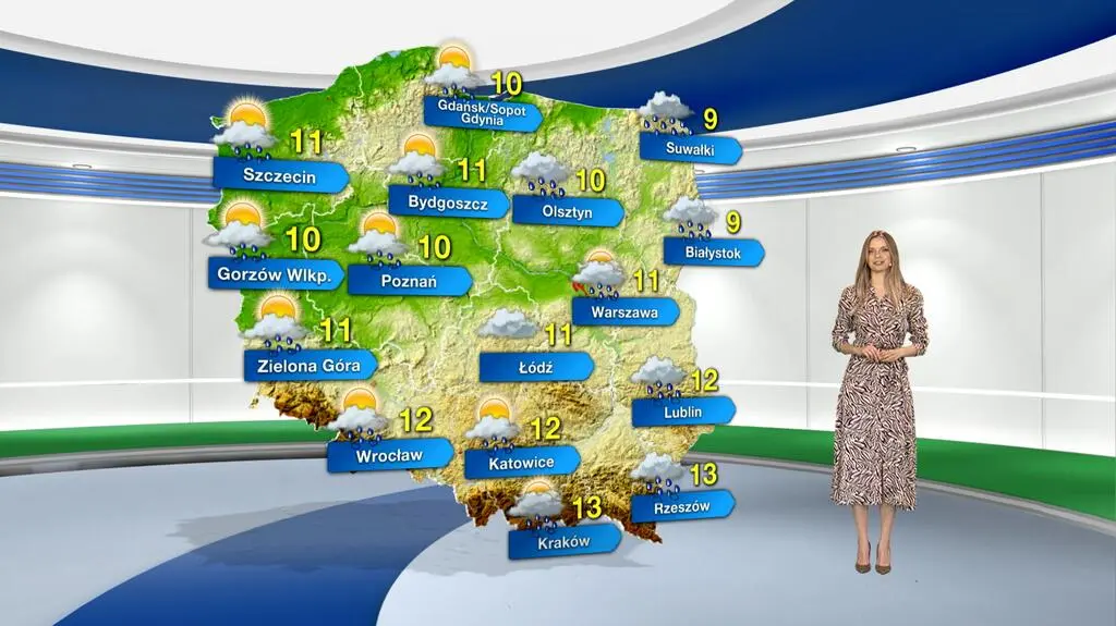 Na czwartek prognozuje się pochmurną aurę z przejaśnieniami i rozpogodzeniami. Poza tym przelotnie popada deszcz, miejscami do pięciu litrów wody na metr kwadratowy. Termometry pokażą maksymalnie od 9 stopni Celsjusza na Suwalszczyźnie do 13 st. C na Podkarpaciu. Powieje słaby i umiarkowany, miejscami silniejszy, przeważnie południowo-zachodni wiatr.