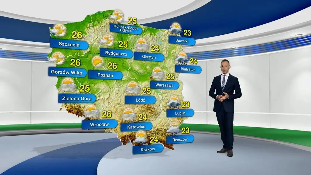 Temperatura maksymalna wyniesie od 23-24 stopni Celsjusza na wschodzie, do 25-26 st. C w centrum i na zachodzie Polski. Wiatr powieje z kierunków zachodnich, słabo i umiarkowanie, na wschodzie i północy okresami okaże się silniejszy, w porywach dochodząc do 50 km/h.
