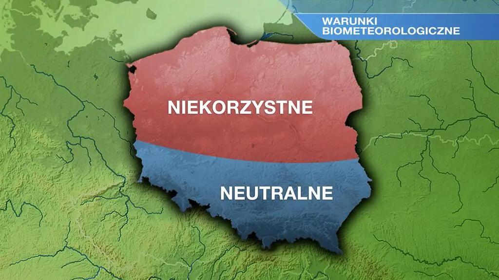Wilgotność powietrza sięgnie 80-90 procent. Warunki biometeorologiczne w południowych regionach, tam gdzie opady nie są spodziewane i temperatura będzie najwyższa, okażą się neutralne. Na pozostałym obszarze Polski aura niekorzystnie wpłynie na samopoczucie.
